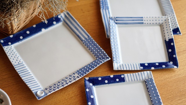 四角リム皿2サイズに、4寸玉縁輪花皿、