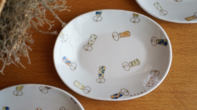 ■楕円リム付皿/カラフルコケシ