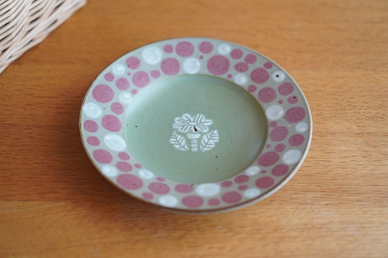 砥部焼/5.5寸縁付皿/赤縁水玉花/皐月窯