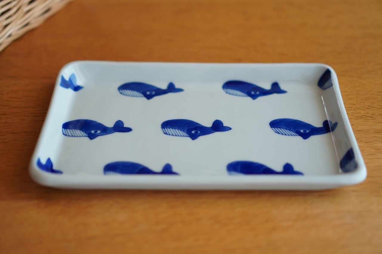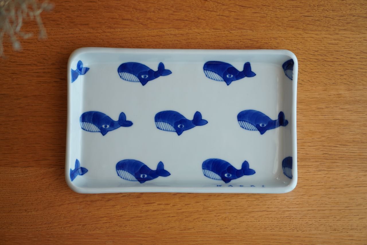 砥部焼/長板皿(特大)/くじら(たくさん)/森陶房kaori